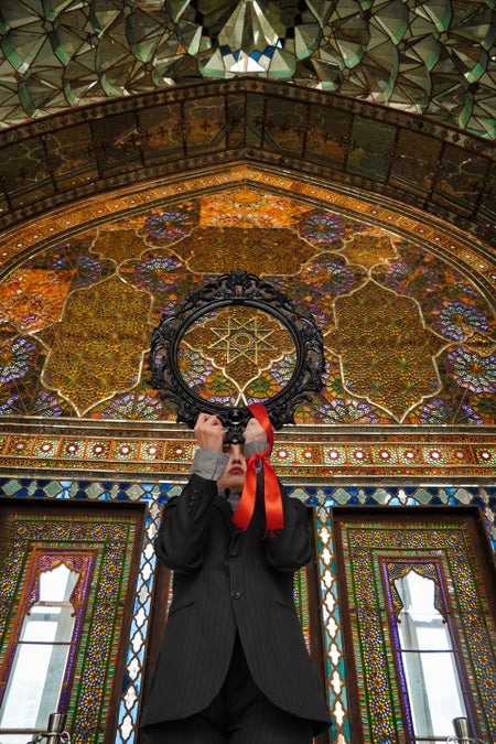 In this image, I stand in Golestan Palace, dressed in a black men’s suit, holding up an empty frame. Behind me looms the portrait of Naser al-Din Shah Qajar, a ruler whose reign is deeply intertwined with censorship, patriarchy, and the historical silencing of women in Iran.